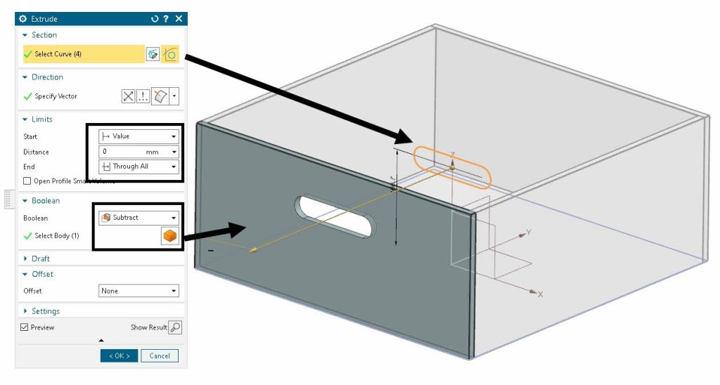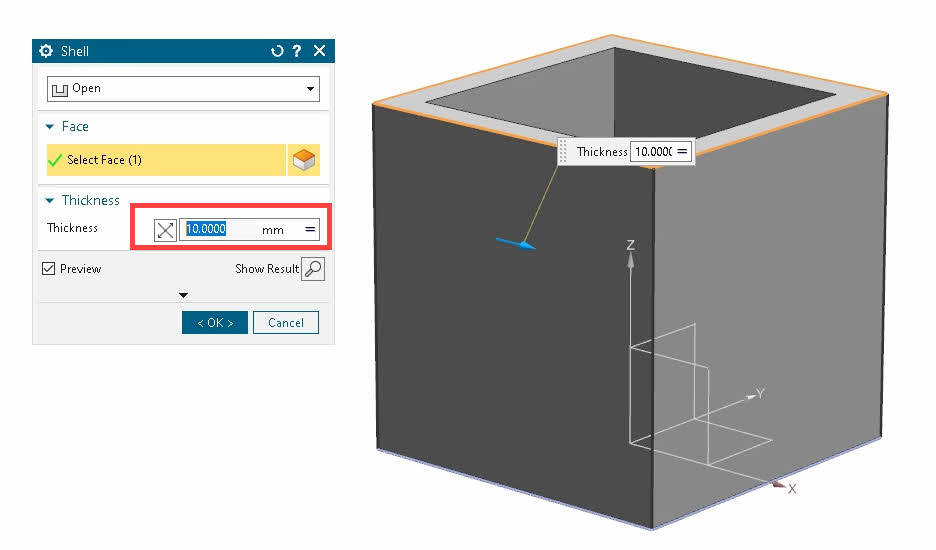 - Create Expressions – W=100mm, D=100mm, H=100 and t=10mm