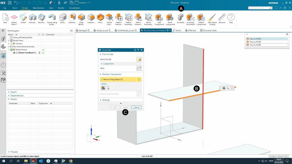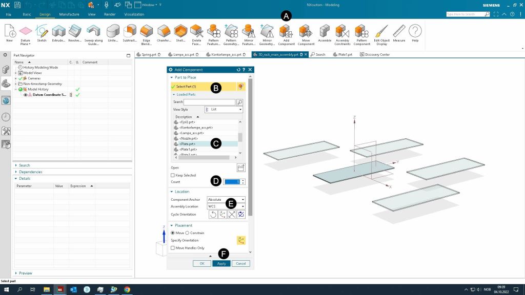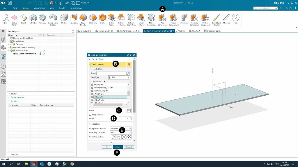 - Add plate.prt to as the first part to the assembly by using Add Component commando. Make sure it has the Fixed assembly constraint.